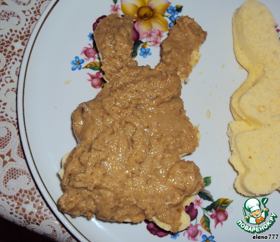 Разрезать бисквитного зайку пополам, промазать кремом. -