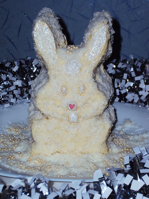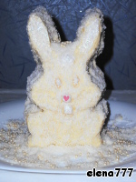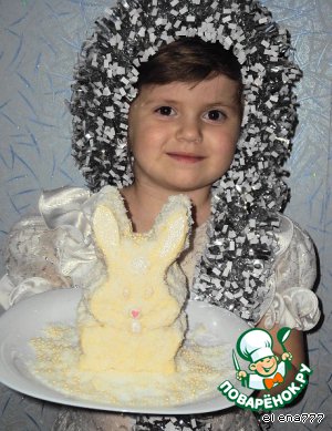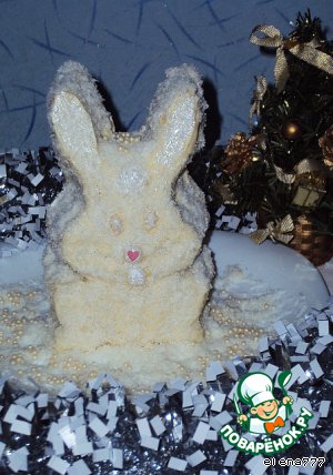 Белый снег кругом искрится, Светятся гирлянды ярко! Кролик в двери к нам стучится, Он принес для всех подарки: И удачу, и везенье, И отличную погоду, И, конечно, поздравленья С новым счастьем! С Новым годом! Приближается 2011 год - год кролика и, чтобы этот год был удачным и счастливым, считается, что в новогоднюю ночь в доме обязательно должен присутствовать символ года - кролик. Его можно нарисовать, вышить, слепить или купить eлочную или мягкую игрушку-зайку, а я решила приготовить пирожное в виде белого кролика-пушистика. Это пирожное - настоящая находка для тех, кому катастрофически не хватает времени. Все прекрасно знают, как бурно проходит предновогодний день, насыщенный приготовлением всевозможных блюд. Так вот, я хочу предложить вам замечательное новогоднее лакомство, которое готовится легко и быстро - всего минут 20, а получается удивительный нежный десерт, от которого и детки, и взрослые придут в полный восторг! Лeгкий, белоснежный шоколадный бисквит, приготовленный в микроволновке, с прослойкой карамельно-орехового пралине и покрытый белым шоколадом "Крем-брюле" доставит истинное удовольствие вашим любимым детишкам(и не только)!