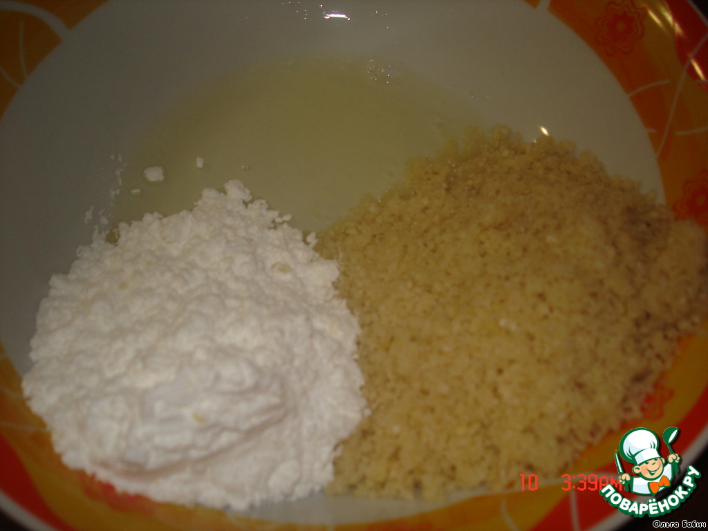 Смешать миндальную крошку, сахарную пудру, белок яйца |