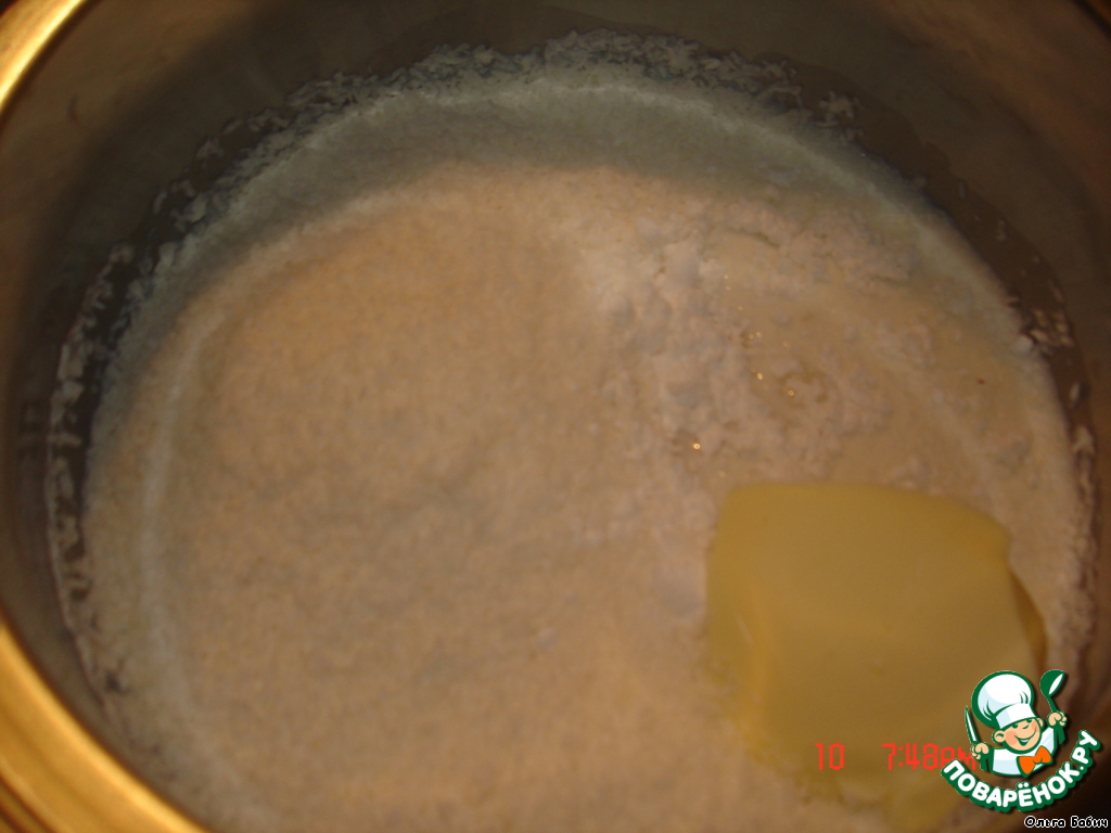 Приготовим крем, нам нужно, чтобы он остыл. В молоко добавить 100 г сахарной пудры, кокосовую стружку, масло. Проварить минут 10, чтобы масса загустела. |