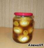 Горячим маринадом залейте яйца, добавьте оливковое масло, закрутите крышку и энергично встряхните содержимое.