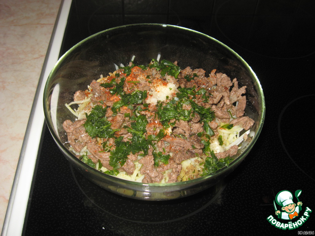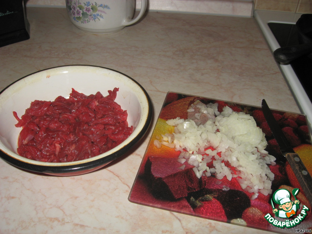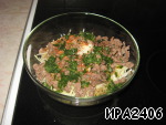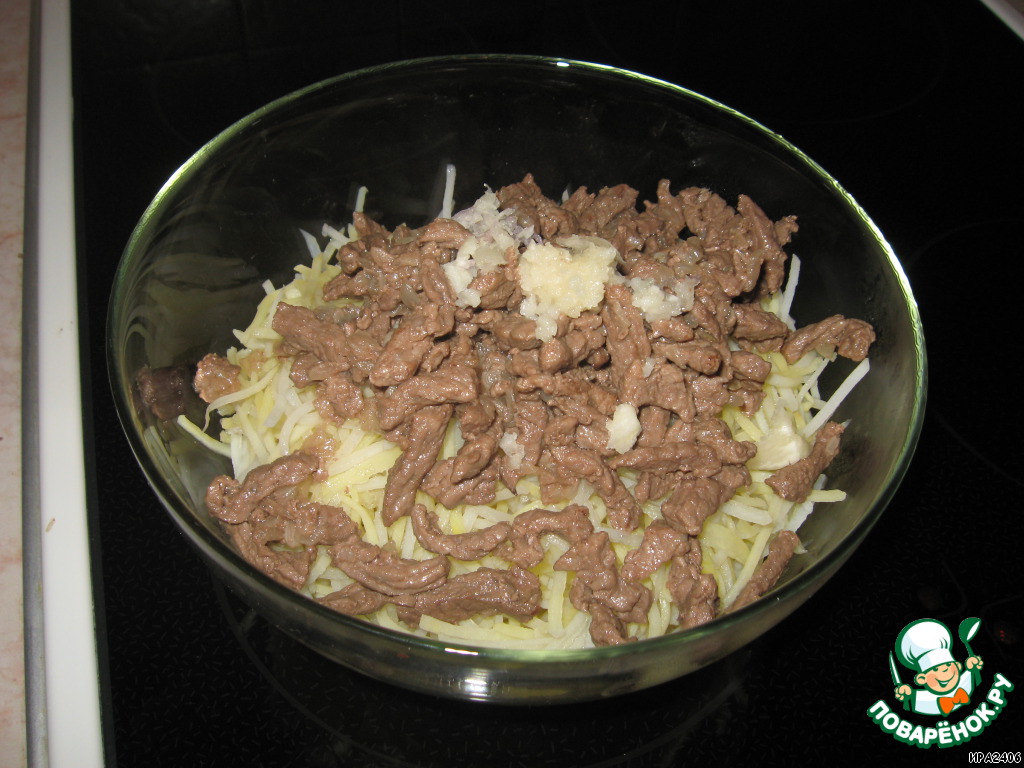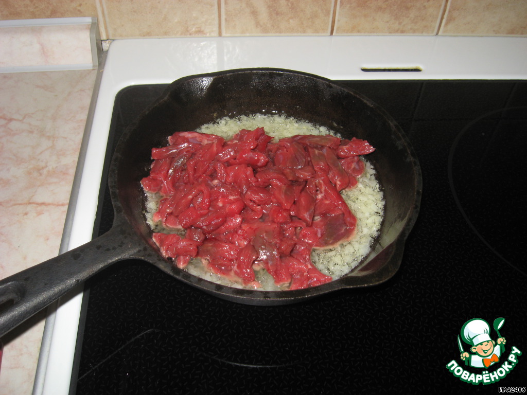 Теперь - обжаренное мясо и выдавленный чеснок.