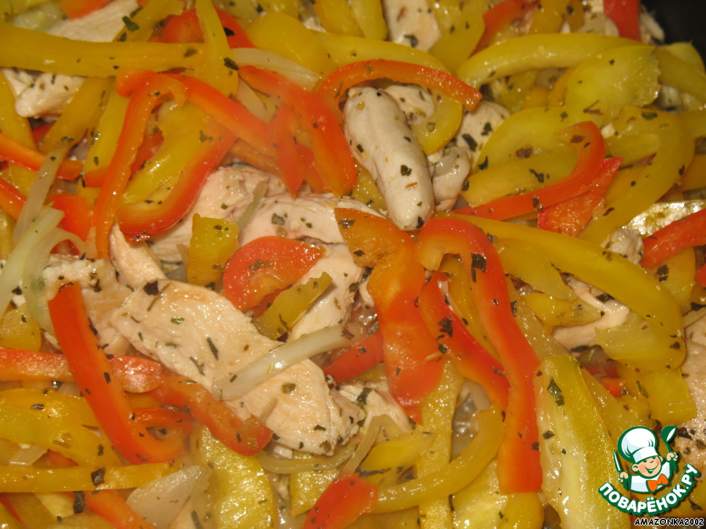 Нарезаем соломкой перец и лук полукольцами. Перемешиваем и посыпаем солью, базиликом, орегано, чесноком и перцем.