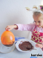 Воздушные шарики обволакиваем шоколадом, делая низ скорлупки - шоколадного яйца. -