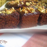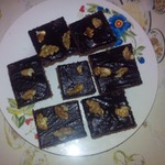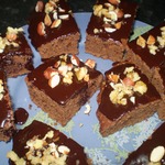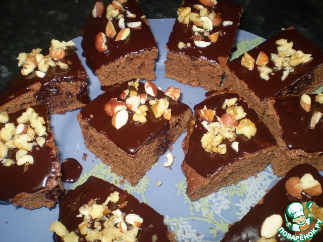 Готовый корж полить остывшей глазурью, разрезать на кубики, украсить орехами.