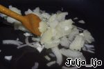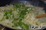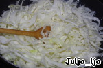 К обжаренному луку добавляем нашинкованную капусту. Не тонко и не очень толсто. Обжариваем вместе с луком, почти до готовности. Солим и перчим по вкусу.