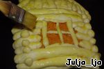 Смазываем желтком. Можно яйцом, молоком, белком. Я смазала избушку желтком, чтобы она была поярче, а второй пирог смазывала остатками желтка, смешанными с белком.
