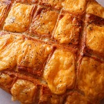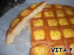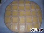 На тесте сделать надрезы около 5*5 см и в каждый квадратик вдавить по кусочку сыра