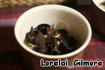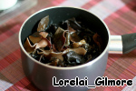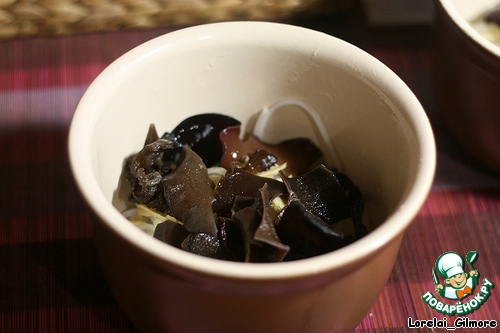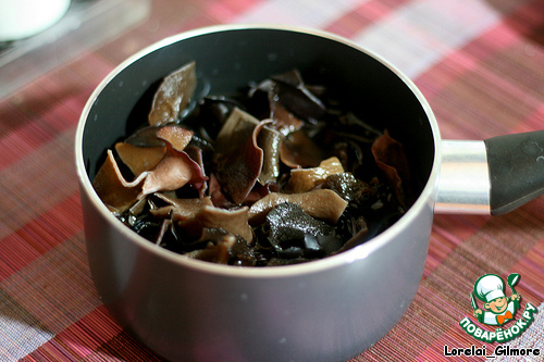 Как и в оригинале рецепта, у меня были древесные сухие грибы. Которые я для начала замочила минут на 40 (в не очень крутм кипятке).