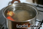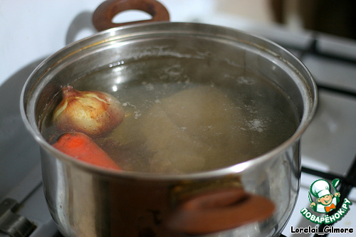 В холодную воду положила голяшку, дала закипеть, тщательно сняла всю пену, положила овощи. И оставила варить на 3 часа. -