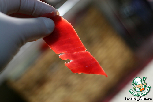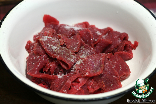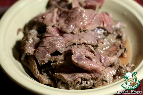 Спустя час нарезала вот такими вот тонюсенькими, почти прозрачными кусочками. Подмороженное мясо легче так тонко порезать.