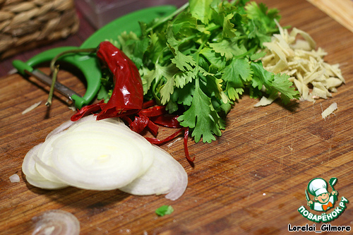 Предварительно луковицу и кусок имбиря я подпекла в духовке и начала варить.