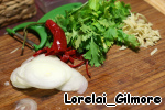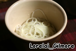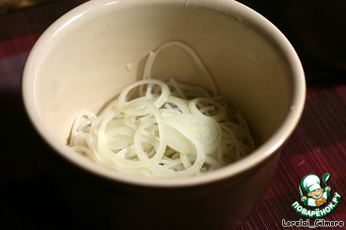 Потом тоненько нарезала кольцами белый лук, острый красный перец.