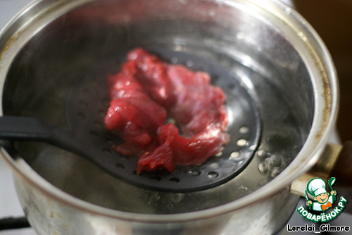 Нагреваем воду так, чтобы было кипение ключом и в шумовке небольшими порциями опускаем мясо ровно на секунду.