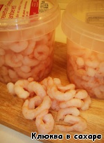 Тем временем займёмся креветками. Для этого блюда можно взять обычные мелкие замороженные креветки, сварить их и почистить (если были в панцире). Но я рекомендую взять маринованные креветки, то есть уже очищенные, сваренные и залитые маринадом (такие, как на фото).