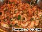 Вынимаем креветки из маринада, добавляем к ним рубленную кинзу и поливаем лимонным соком.