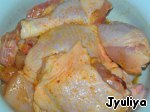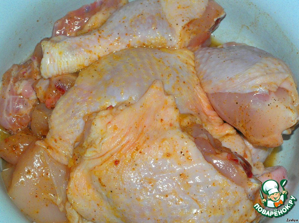 • Цыпленка нарезать на порционные кусочки, посолить, добавить специи, сок одного апельсина, перемешать. Оставить на 15 минут.