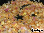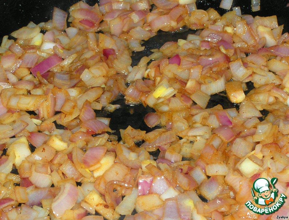 • Лук нарезать кубиками, обжарить на растительном масле. Здесь я добавила немного соевого соуса, но это не обязательно.
