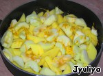 • Форму смазать маслом. Яблоки очистить от кожуры. Картофель и яблоки нарезать крупными дольками. Посолить. Добавить немного цедры апельсина.