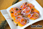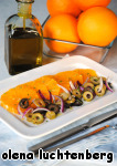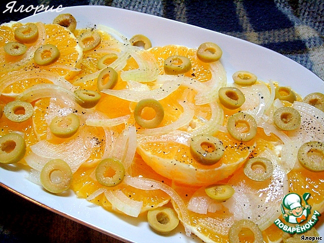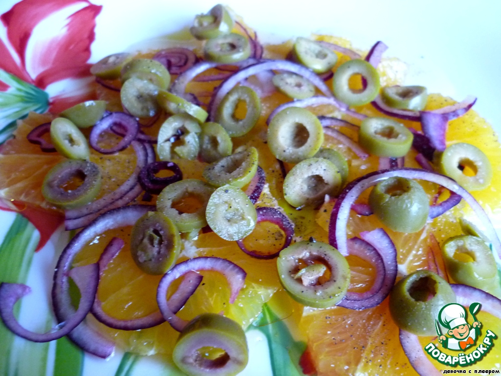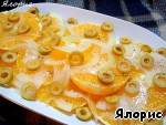 Лук нарезать очень тонкими кружочками, выложить на апельсин.