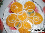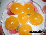 Апельсин очистить, тщательно удаляя белую мякоть. Нарезать тонкими кружочками.