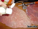 Если же у Вас постная свинина цельным куском, то её нужно разрезать по спирали в плоский кусок, а потом отбить и посолить. -