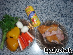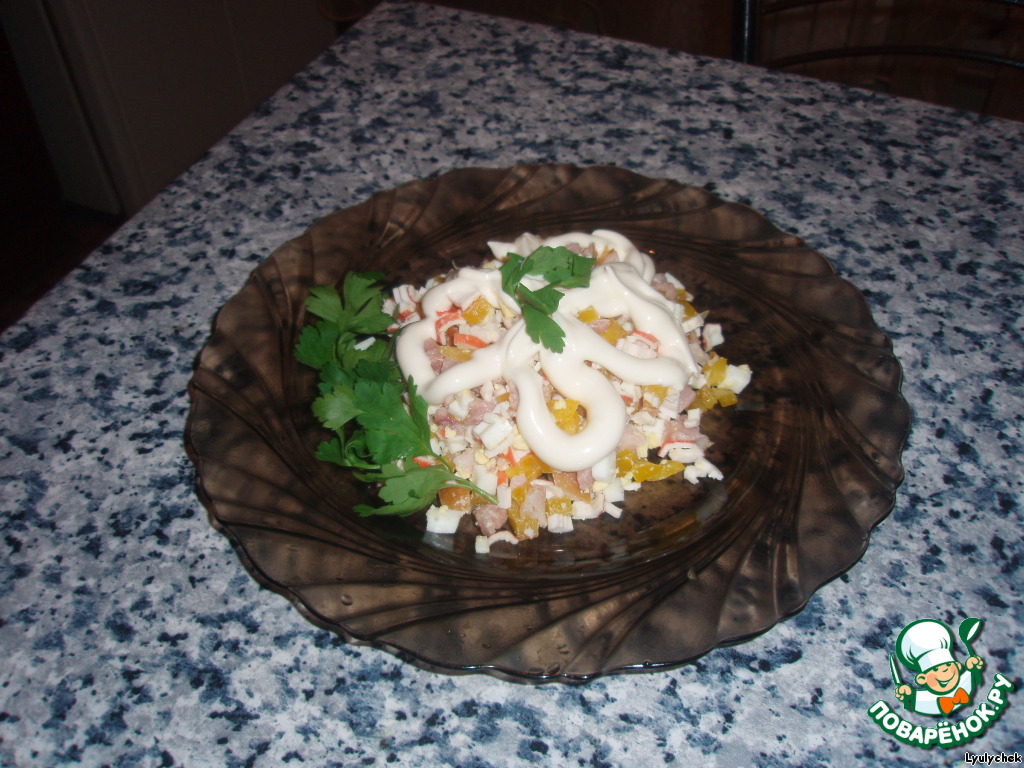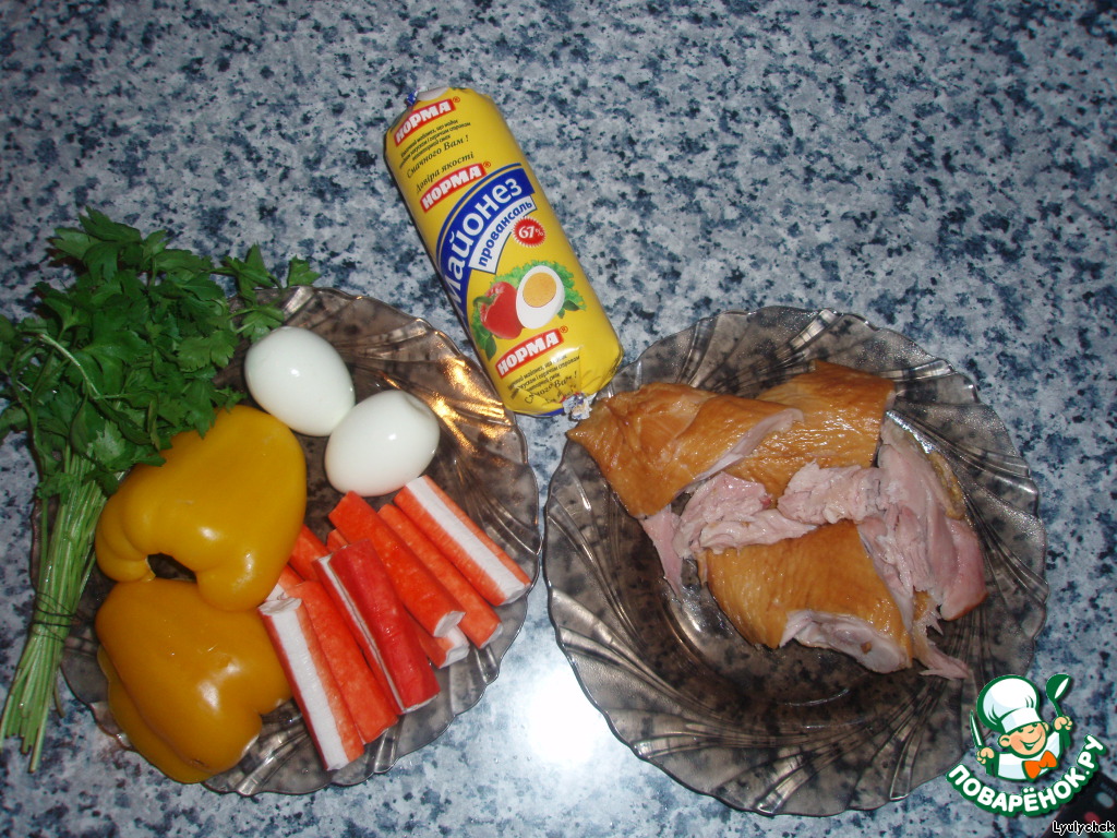 Нежная копченая курочка в сочетании с крабовыми палочками и свежим болгарским перчиком - неописуемо вкусно, нежно, а самое главное, быстро и не дорого!!!! Салатик на каждый день.