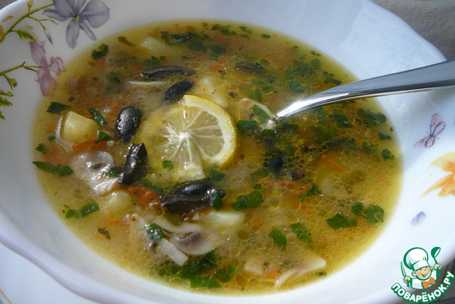 При подаче украсить суп маслинками, кружочком лимона и свежей зеленью. Приятного аппетита!