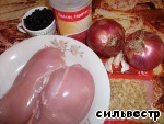 Лук мелко режем, пассеруем до прозрачности, добавляем мелко нарезанную грудку и чеснок, выдавленный прессом или тертый. Солим, перчим и пассеруем, пока мясо не приобретет белый цвет из розового.