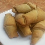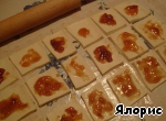 Кладем немного джема в середину квадратиков и сворачиваем в трубочки. При выпекании трубочки будут раскрываться, поэтому джем кладем густой, совсем немного.