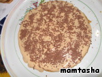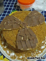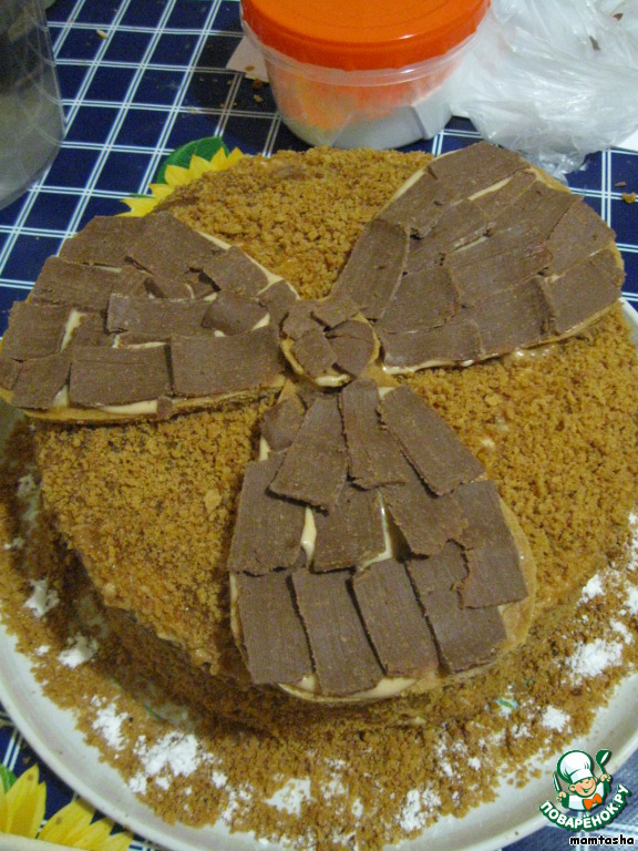 17. Украшаем сахарной пудрой и остатками перемолотых коржей блюдо вокруг торта. Торт готов, единственное - необходимо его выдержать в холодильнике часов 5. Но можно уже кушать, если не терпится совсем. Мы оставляли на ночь.