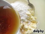 Добавьте муку с разрыхлителем и коньяк, перемешайте.