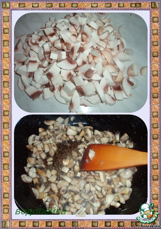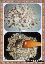 Грибы почистить, порезать кубиками (не очень крупно, хотя это не имеет значения). Обжарить на растительном масле до выпаривания жидкости и чуть золотистого цвета. Вконце посолить их и поперчить. Дать грибам остыть немного. -