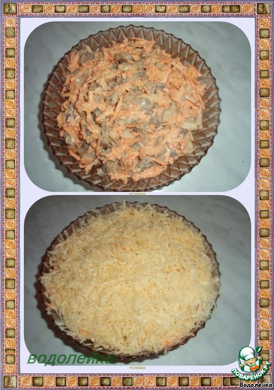 Выложить в салатник. Сверху потереть сыр так, чтобы слой сыра хорошо прикрыл наш салат.