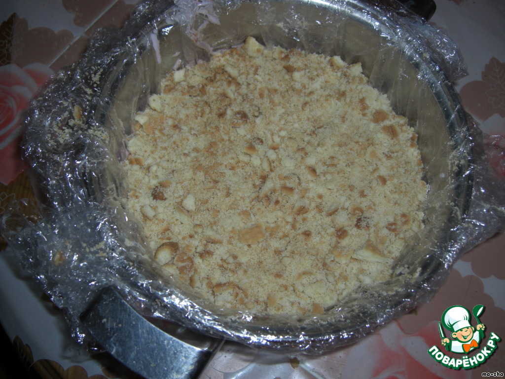 Измельчаем в крошку оставшееся печенье и укладываем сверху (я сделала достаточно толстенький слой).