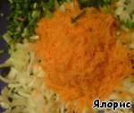 Капусту очень тонко шинкуем, перетираем с солью, натираем морковь, нарезаем зеленый лук.