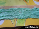 Растапливаем на водяной бане белый шоколад, сливки смешиваем с голубым красителем и получившуюся массу выливаем на пергаментную ленту, оборачиваем тортики и отправляем в холод застывать.