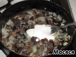 Затем дoбавляем сметану к грибам, перемешиваем.