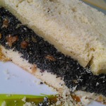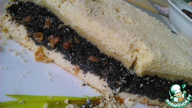 На слегка подпечённый корж выкладываем сначала маковую начинку...