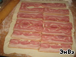 Тесто раскатываем прямоугольником, выкладываем на него полоски бекона.