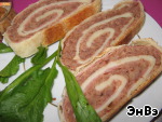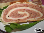 Сворачиваем рулет, выкладываем на противень и ставим в разогретую духовку. Печем при t 180* 40-45 минут. За 5 мин до готовности смазываем смесью желтка с молоком и переводим на верхний огонь (при наличии такового, разумеется).