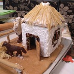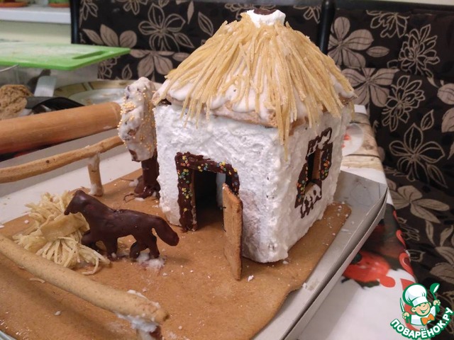 На домик приклеиваем пряничек, нанесём снег всё той же глазурью и вот... торжественный момент... Кошкин домик готов! Ур-р-р-р-а-а-а-а!!!
