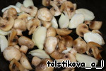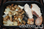 В эту же форму уложить обжаренные грибы с луком и отправить в разогретую духовку минут на 10.