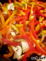 В сковороду вольём 1, 5 ст.л. масла и обжарим грибы и сладкий перец (около 7-10 минут)