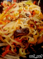 Рецепт этого блюда был размещeн на сайте в 2009 году пользователем Yulya001 под названием "Мясо с имбирем и грибами" и иллюстрирован мной в рамках акции "Раскраски".
