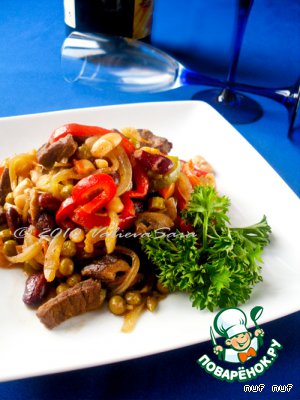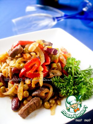 Горошек и фасоль смешать с обжаренными овощами и грибами, добавить мясо, посолить по вкусу и прогреть всё 4-5 минут.