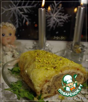 Ангелы... Мне очень хотелось сделать что-то на тему этих сказочных, а, возможно, и нет, персонажей. Сказки с ними, всегда немного грустные, но очень светлые и добрые. Собственно, сам персонаж - уже олицетворение сказки. Вот и к нам прилетела пара ангелочков и поселилась на окне, а угостить их мы решили нежнейшим рулетом из куриного филе, с паштетом, грибами и орешками. Завернули мы рулет в миндально-сырное слоeное тесто. Ну и, наконец, покрыто это всe, словно крылом ангела, нежной шапочкой из сыра и фисташек.