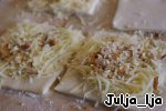 Теперь тесто разрезали на 4 квадрата. 3 из них посыпали сыром и миндалём.