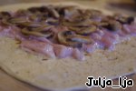 На тесто выложили куриное филе. Оно стало нежным-нежным от сливок. Приправляем филе по вкусу солью, перцем и мускатным орехом.