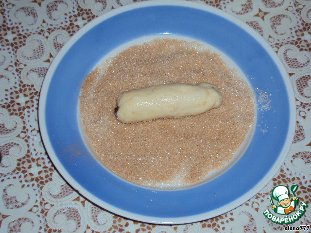 Сделать из теста палочки и одной стороной обмакнуть в смесь сахара и корицы.